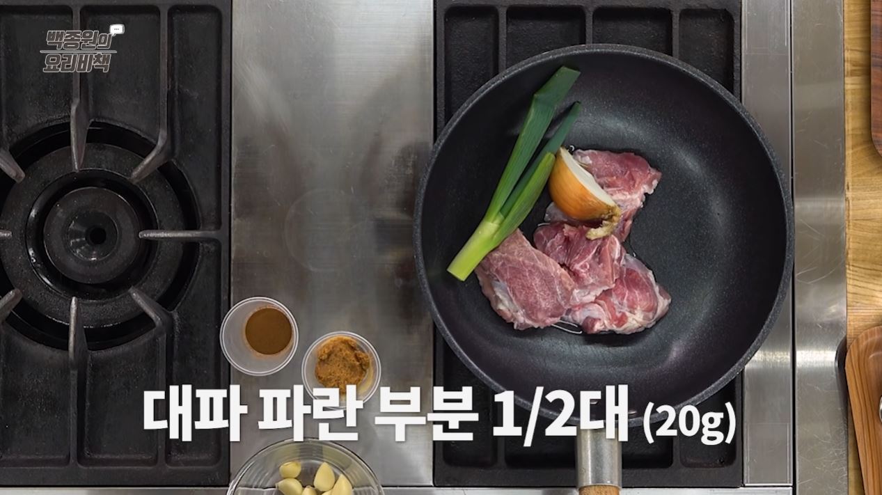 tip) 양파는 껍질 있는 상태로 삶아야 색도 좋고 잡내를 잘 잡아줍니다. 요리 활용도가 높은 부분은 파의 흰 부분이니 수육 삶을 때는 파란 부분을 사용합니다. 통마늘과 통생강은 잡내를 잡기보다는 조미료 역할을 합니다. 생강을 편으로 썰어서 넣으면 향이 강해지니 꼭 통으로 넣습니다. 통생강이 없는 경우 생략하셔도 좋습니다. 수육은 오래 끓이는 요리이기 때문에 고기 양의 대략 10배 정도의 물이 들어갑니다. 뒷다리나 삼겹살을 사용하시는 분들은 물을 3L만 넣고 40분에서 한 시간 끓여주면 됩니다.