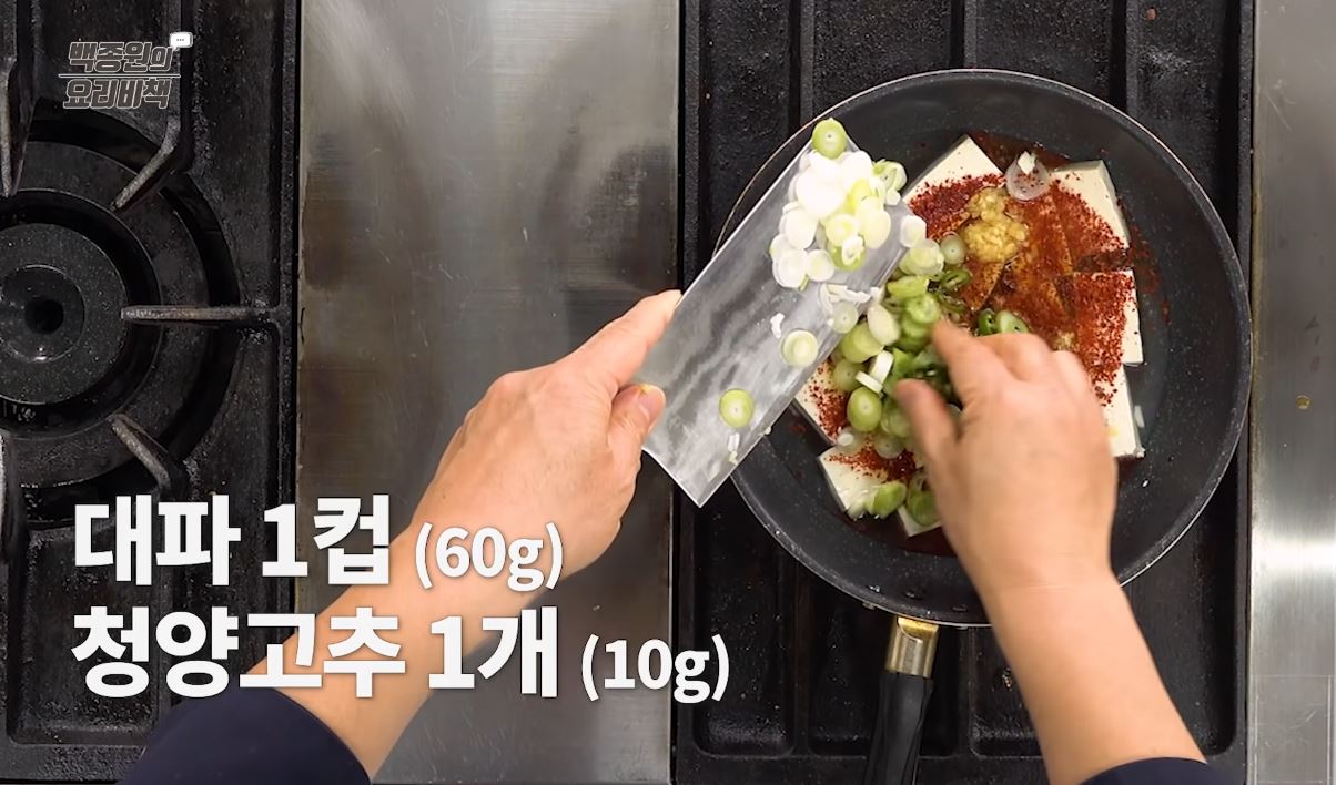6. 대파, 청양고추 썰어놓은 것을 뚜껑처럼 위에 올려준 후 불을 켜줍니다.