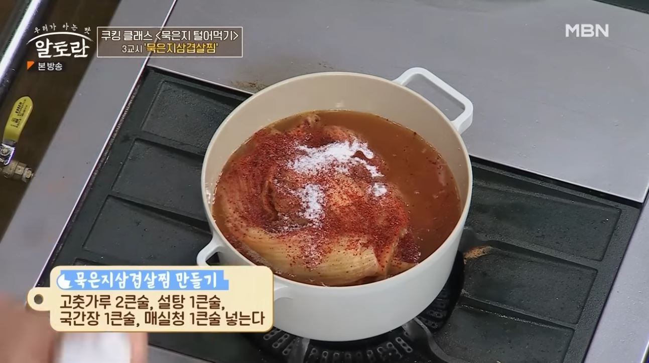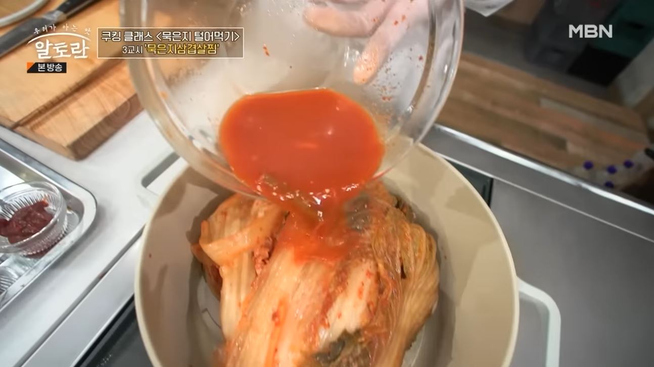 tip) 집집마다 간이 다른 묵은지 맛의 균형을 잡기 위한 양념입니다. 묵은지의 신맛을 백설탕으로 잡아줍니다. 찜을 만들다 보면 약간 국물이 묽게 나올 수도 있습니다. 그때 색깔을 잡아주는 것이 된장입니다.