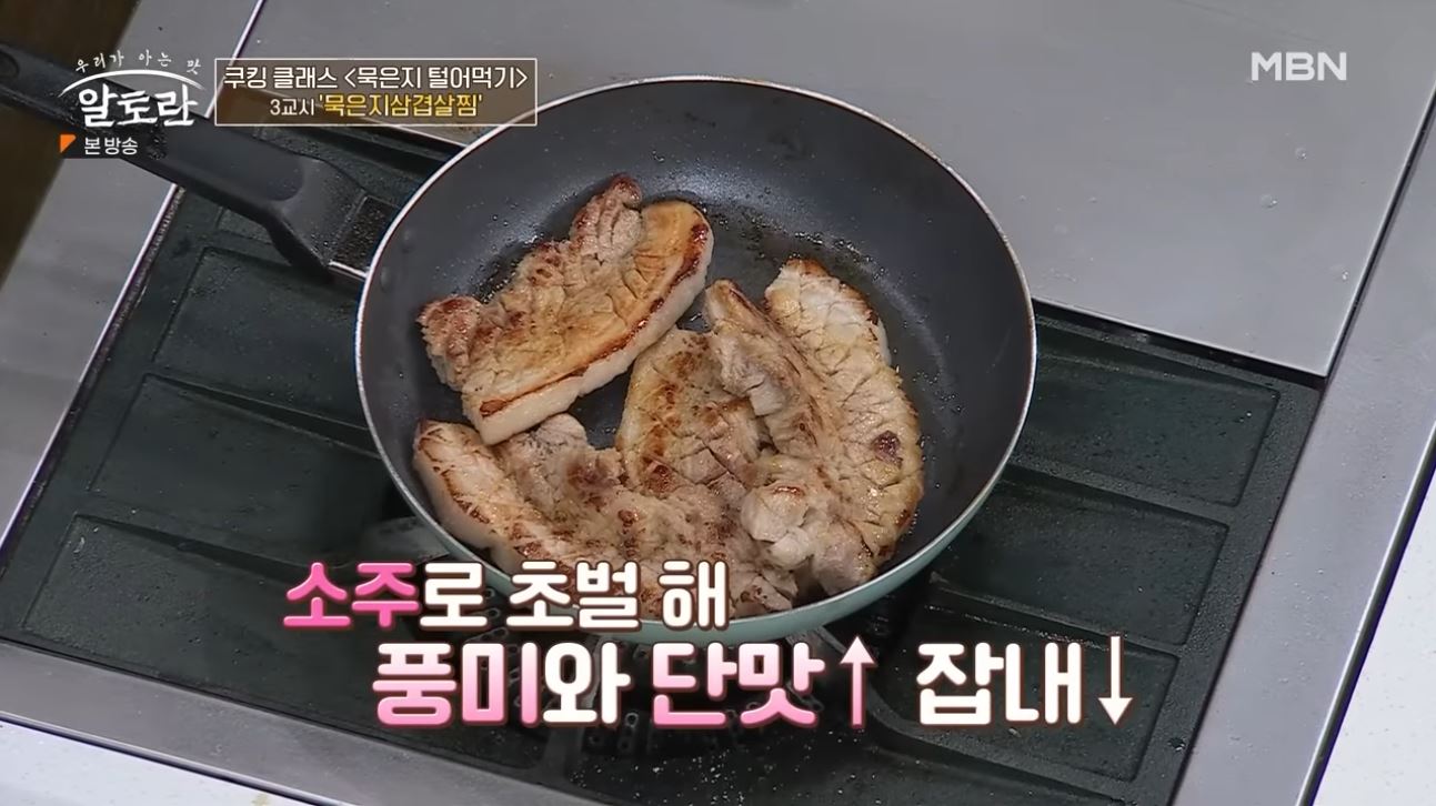 tip) 삼겹살을 다이아몬드 모양의 칼집과 묵은지 중간에 넣어주는 방식으로 양념이 더 깊게 배어들어 부드럽고 진한 맛을 만들어줍니다.