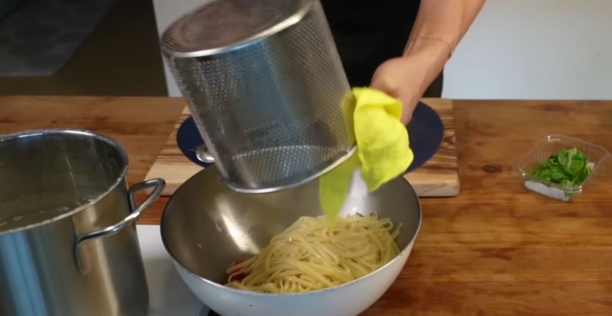 8. 면이 다 익으면 찬물에 헹구지 않고 물기만 제거한 뒤 재료가 담아있는 볼에 뜨거운 그대로 넣어줍니다.