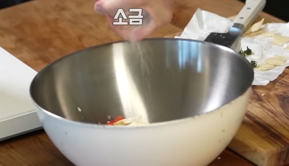 7. 소금, 후추를 넣고 올리브오일을 한 바퀴 둘러줍니다.