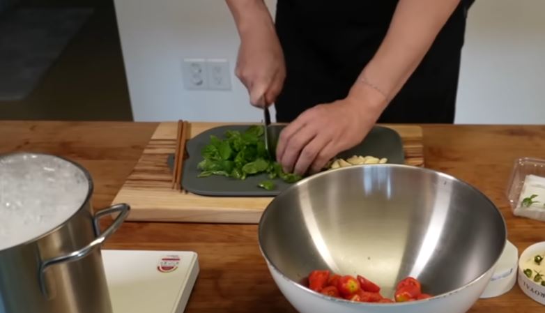 tip) 처음에는 바질을 반만 넣어줍니다. 재료를 모두 섞은 다음에 깨끗한 바질을 추가로 넣어주면 색감이 더욱 먹음직스럽게 살아납니다.
