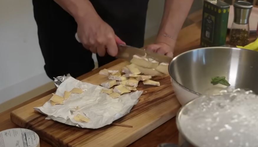 6. 브리치즈를 듬성듬성 썰어서 볼에 넣어줍니다.