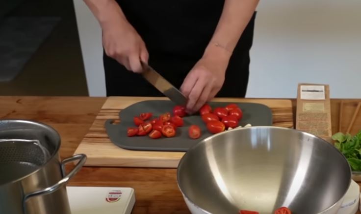 2. 방울토마토 꼭지를 따고 4등분 하여 볼에 넣어줍니다.