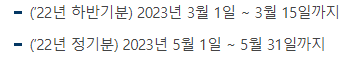 왼쪽에 보시면 근로장려금 정기 신청 보이실 거예요. 이 파란색 신청하기를 누르시면 기한 후 신청이 가능하고 오른쪽에 빨간색 부분은 곧 있을 근로자려금 반기 신청 부분입니다. 9월에 23년도 상반기 분의 근로장려금 반기 신청 부분인데요 이 부분도 9월에 다시 한번 안내해 드리겠습니다.