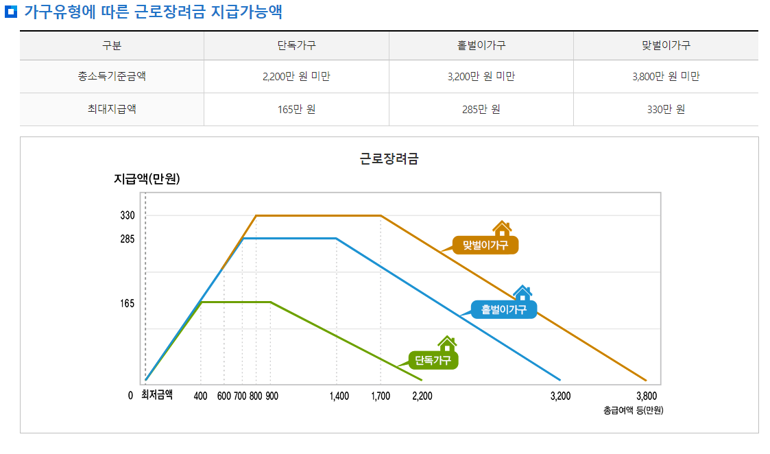 아래의 그래프로 근로장려금을 가장 많이 받으실 수 있는 구간과 가장 적게 받게되는 구간을 확인해볼 수 있습니다.