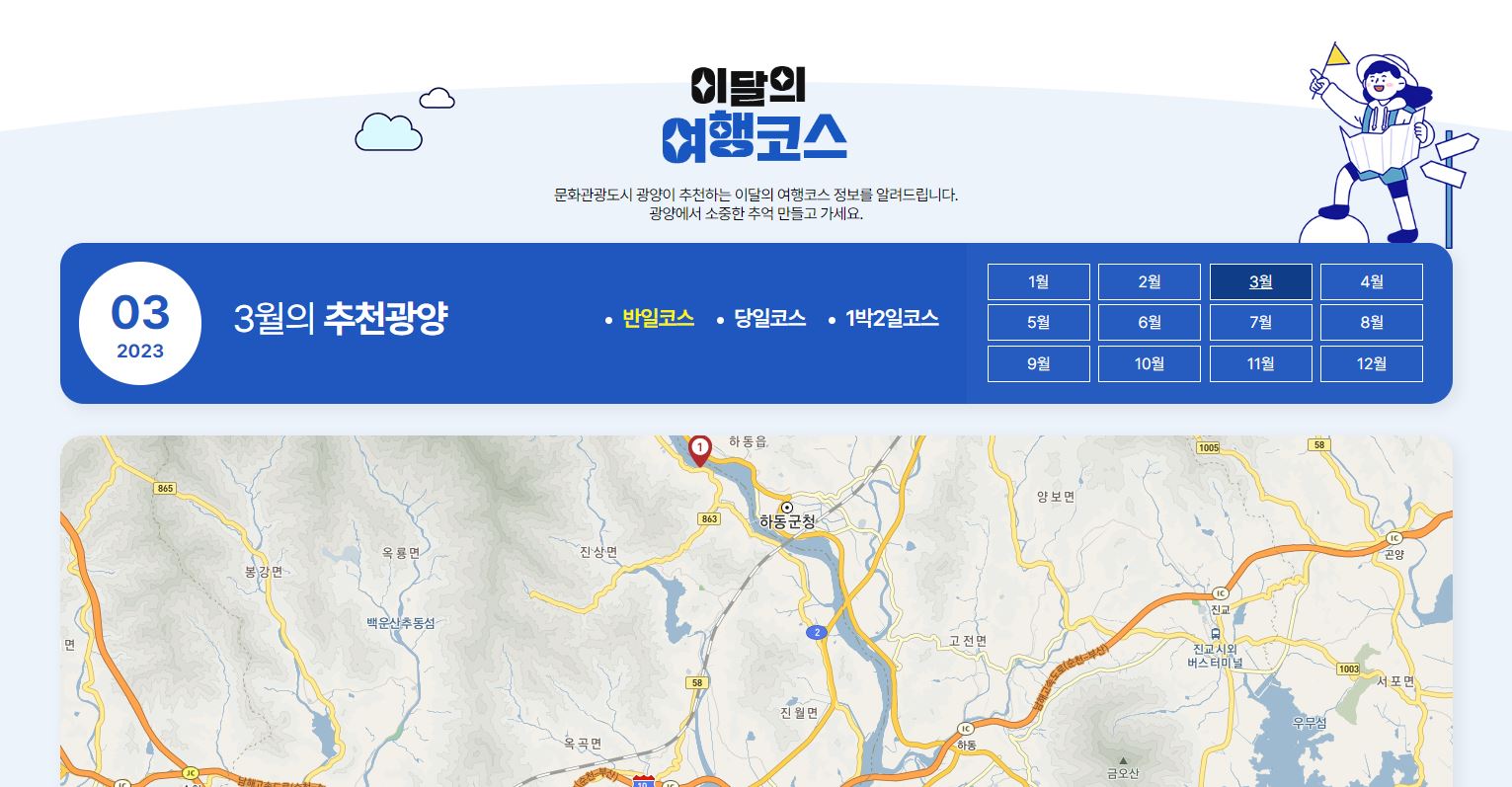 3월 매화 코스 링크로 들어가시면 문화관광도시 광양이 추천하는 이달의 여행 코스 정보를 확인할 수 있습니다. 반일코스, 당일코스, 1박2일 코스로 나누어져 있으며 여행객들에게 볼거리와 먹을거리 정보를 손쉽게 찾아볼 수 있게 정리되어 있습니다.