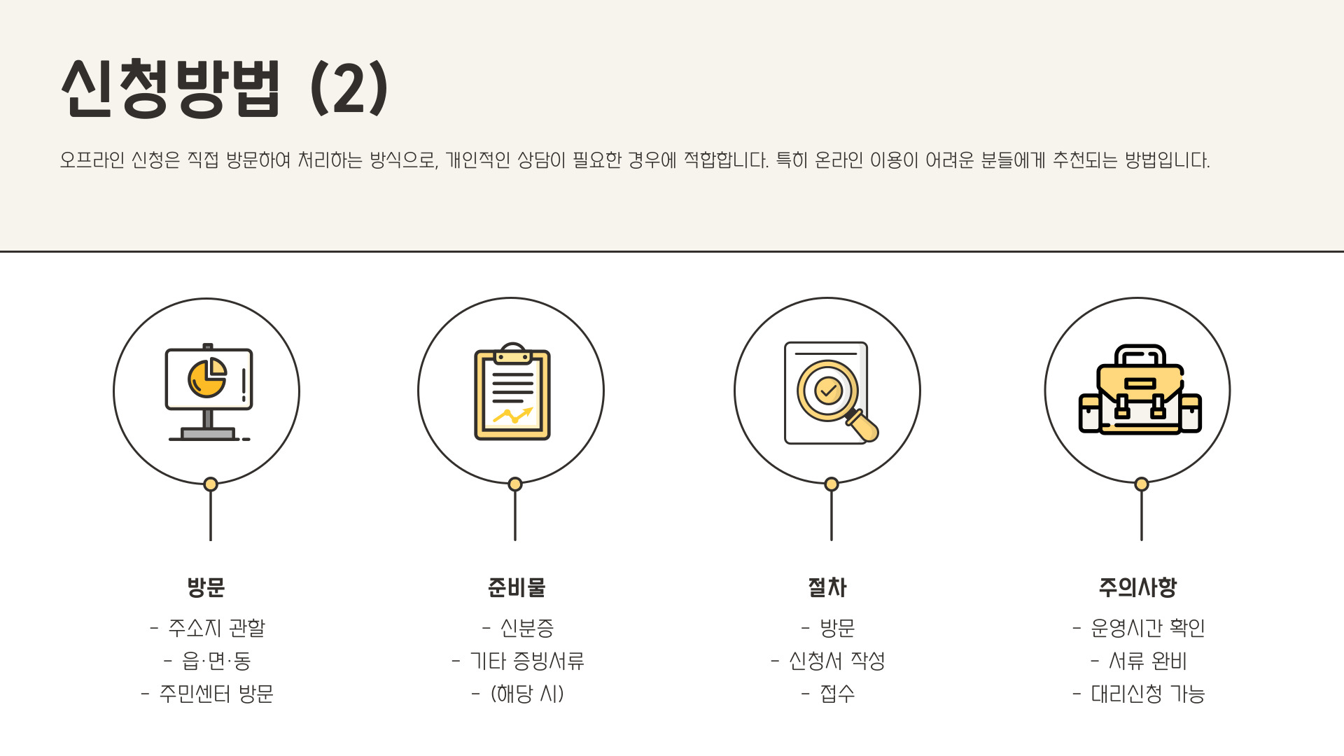 - 신분증 지참, 신청서 작성 후 접수
