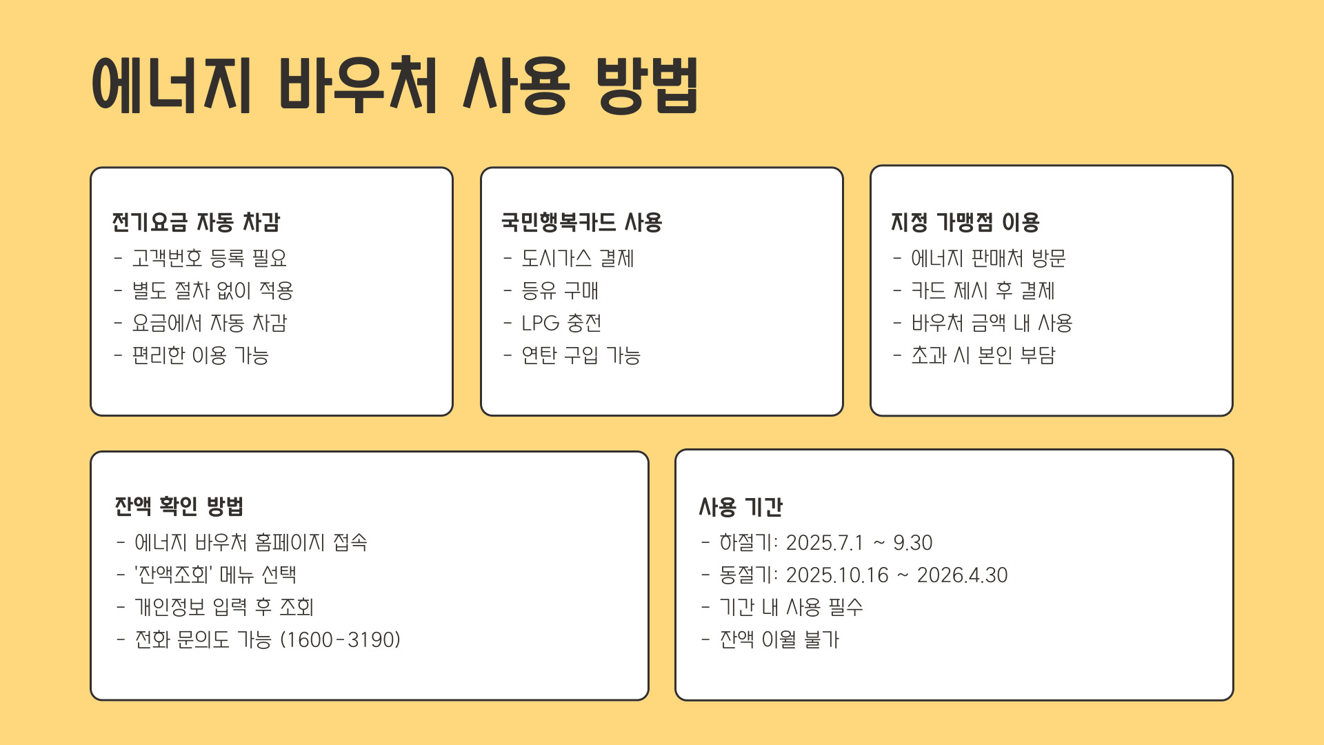 - 국민행복카드 사용: 도시가스, 연탄, 등유, LPG 충전 등 결제 가능