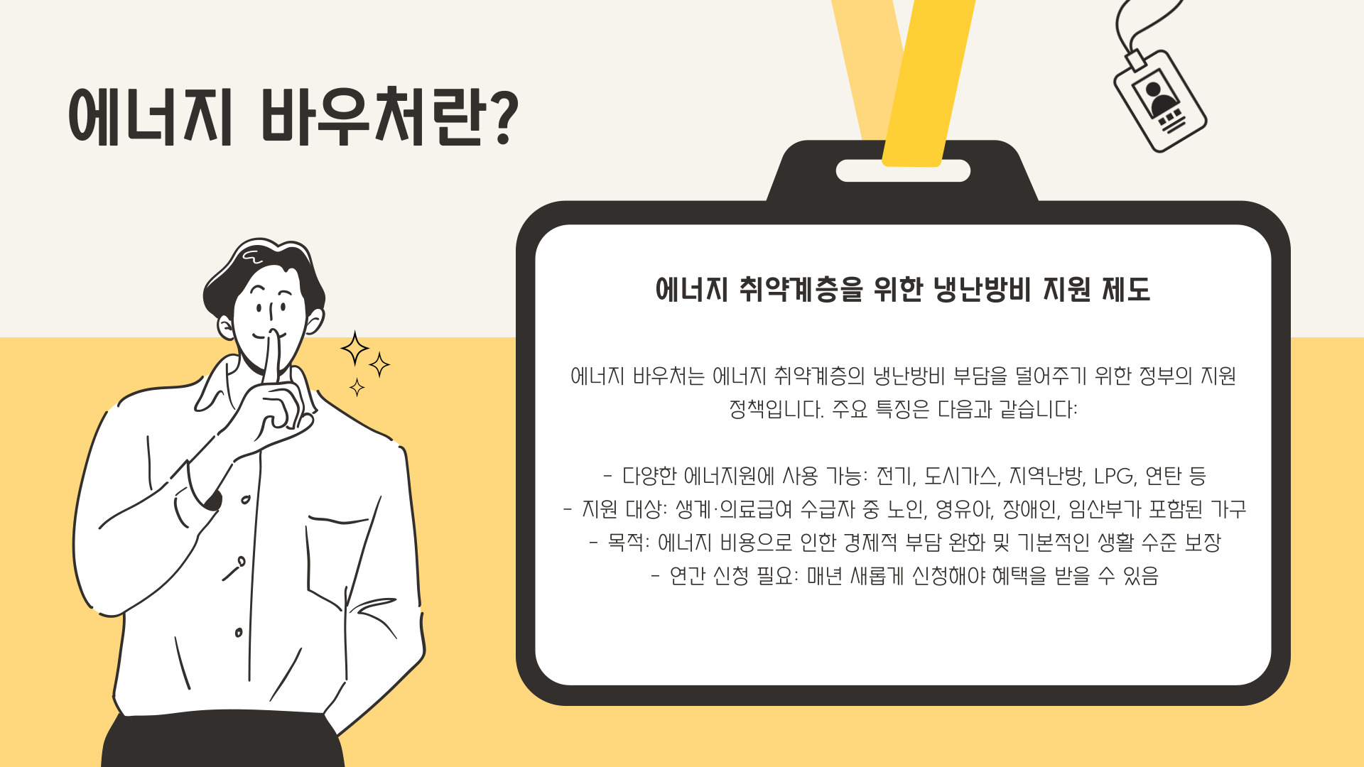 ‘에너지 바우처’는 에너지 취약계층의 냉난방비 부담을 덜어주는 지원금입니다.