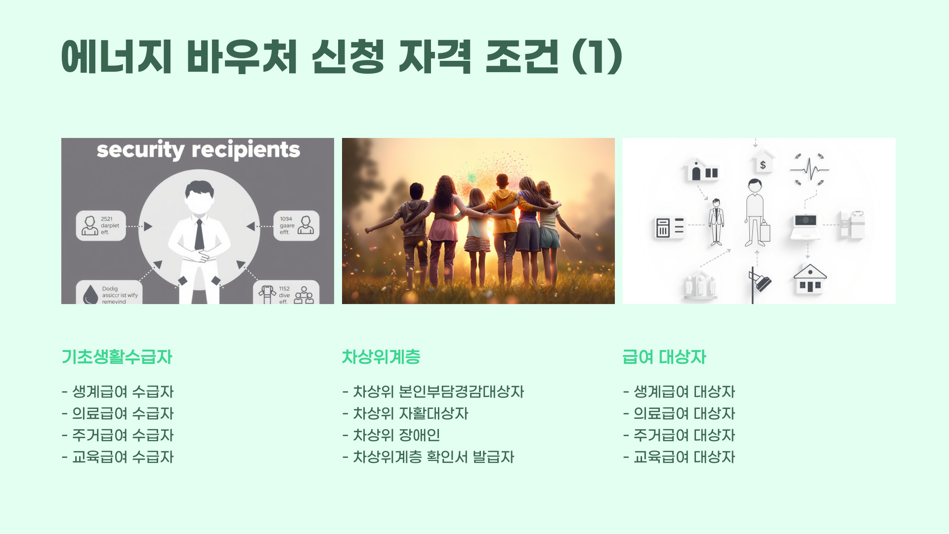 1. 기초생활수급자 또는 차상위계층 (생계·의료·주거·교육급여 대상자)